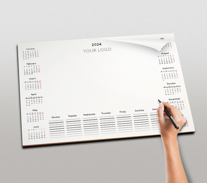 As a springboard to help you create your own printed desk pads, we’ve created some layouts for you to customise. Simply pick the layout that most closely aligns with your planning needs and rearrange it as you see fit. Once you’ve added the all-important branding, you’ll have a unique piece of promotional material that’s immensely valuable to audiences.