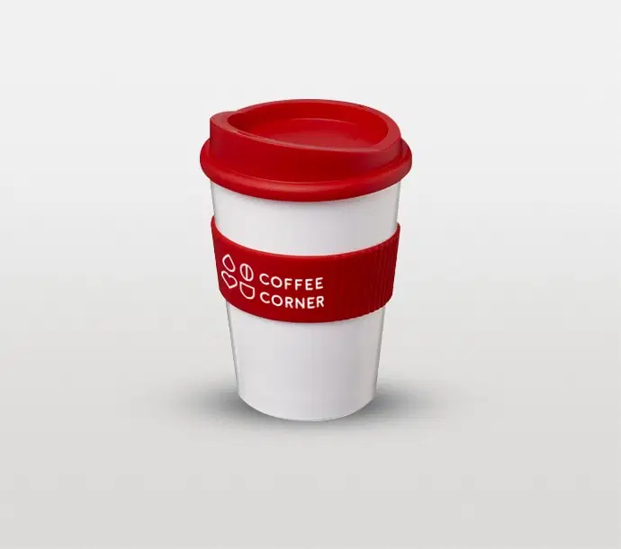 Let your customers refresh themselves on the go with custom Tumblers that are made to be swigged on the move. Their press-on lids stop spillages while the aperture is the perfect size for sipping. Keep the lid over the Tumbler to reserve the beverages heat. Its silicone grip makes the Cup easy and safe to hold while drinking. We offer two sizes: 250ml or 300ml, with a large selection of colours to change the design of your Cup, lid and grip. Screenround print your artwork on the grip in a single colour on a large 195 x 10mm area.